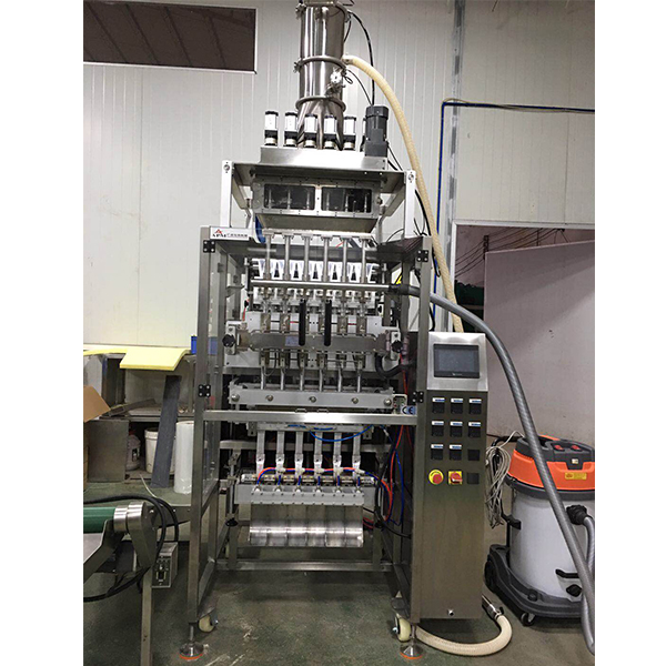 多列粉末包裝機是專門用來包裝條狀粉末類型物料的,采用螺桿計量裝置自動進行物料的計量,每一列數(shù)對應(yīng)一個螺桿計量裝置,也就是說10列粉末包裝機就有10個螺桿計量機。另外這臺多列咖啡粉包裝機還配置了一個吸塵器,一般情況下多列機包裝粉末的時候,在下料的過程中會有揚塵的現(xiàn)象,不除去揚塵,會導(dǎo)致封口不密封,封口不美觀,這個吸塵器的作用就是把揚塵吸掉,保證密封性,增加封口的美觀度。